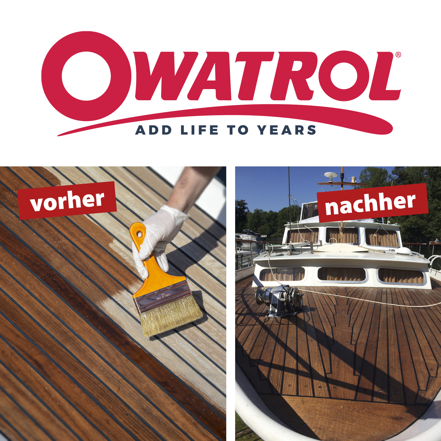 - Überwasserbereich: mit OWATROL MARINE D2, 1-K-Klarlacken, einkomponentigen Primern, Alkyd- und (nach Vorversuch) mit 1-K-PUR-Lacken überstreichbar