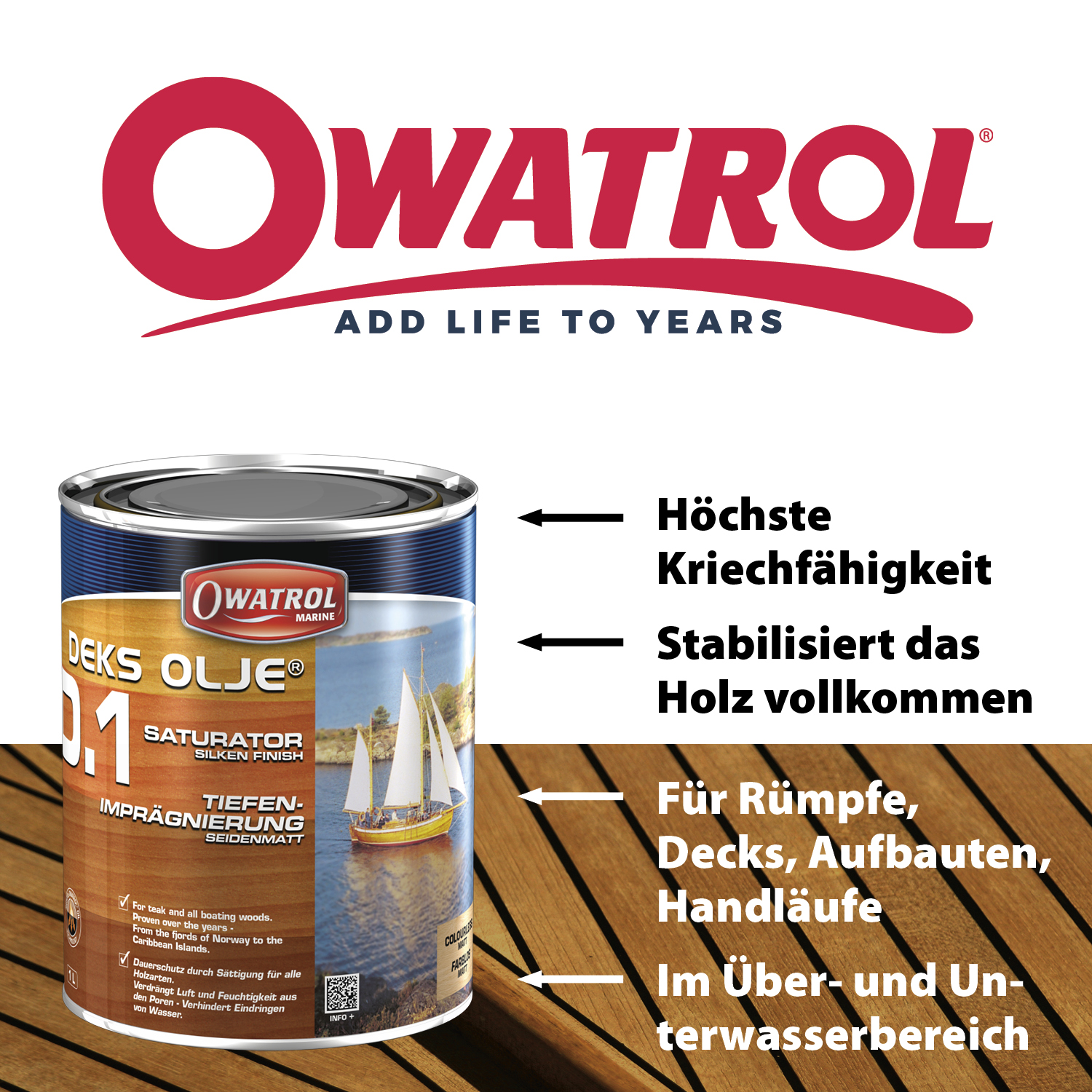 OWATROL DEKS OLJE D1 durchtränkt das Holz aufgrund seiner Dünnflüssigkeit und seiner enormen Kriechfähigkeit vollständig. Verbleibt lange „nass“, so sind weite Tränkwege möglich. Verdrängt vorhandene Feuchtigkeit und Luft nach außen. Füllt die Holzporen und umhüllt die Holzfasern.